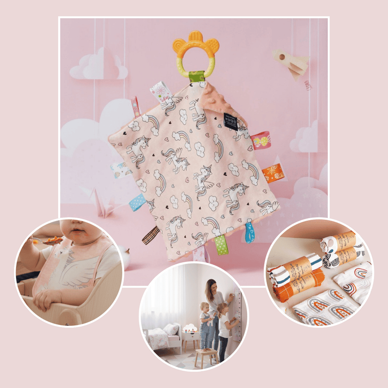 This all-in-one gift set features a Taglet Unicorn Security Blanket, providing comfort and a soothing companion for naps, bedtime, and quiet moments. The Forest Face Bib Unicorn adds a playful touch to feeding time while remaining practical and easy to wear. The Pink Unicorn Wide Height Chart lets parents track milestones while adding a decorative element to the nursery. Completing the set, the Rainbow Bamboo Swaddle Blanket provides soft, breathable comfort for swaddling, cuddling, and on-the-go use.